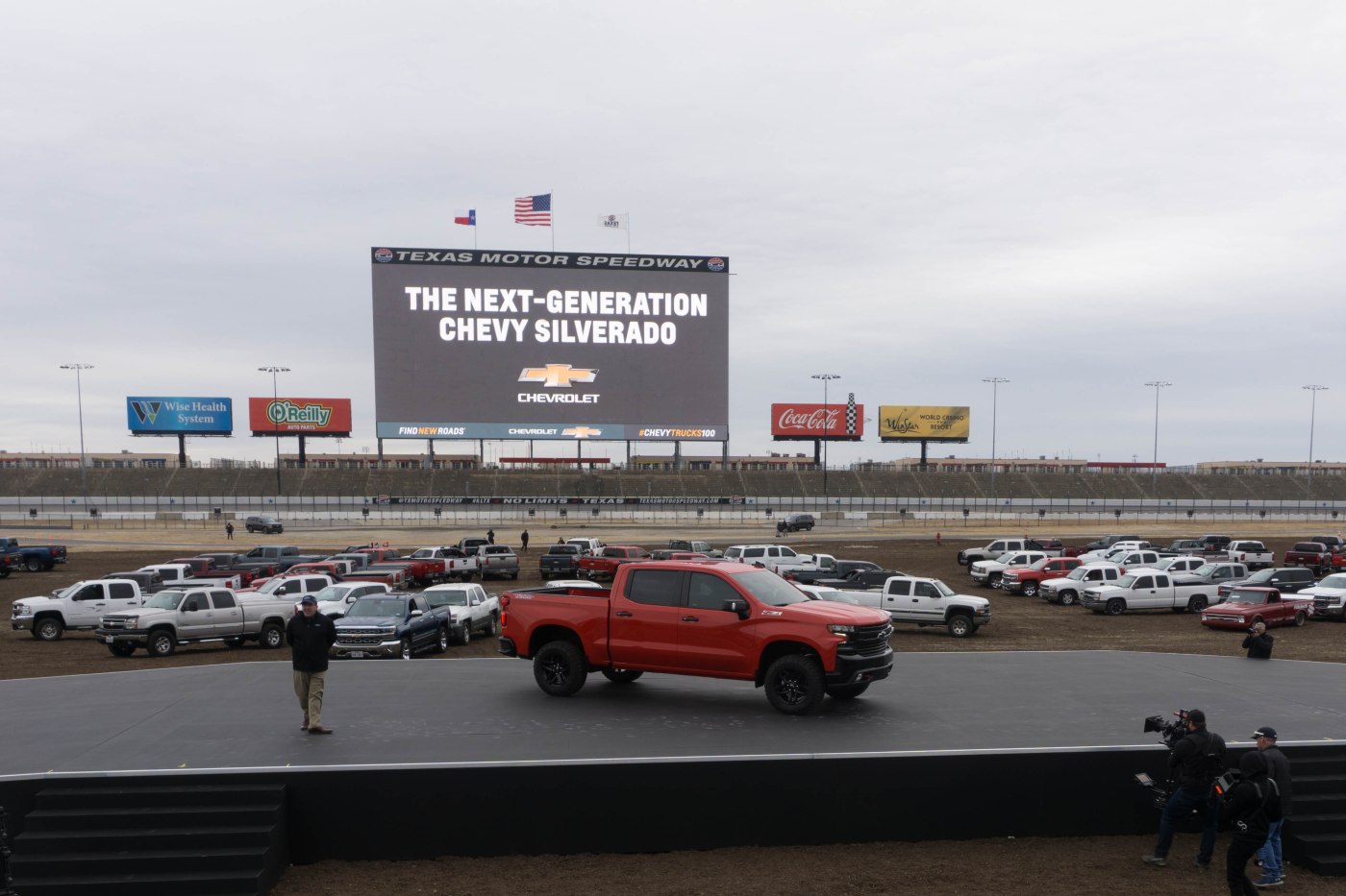 The event’s climax, following the Earnhart interview, came when a cargo helicopter bearing the Chevrolet “bow tie” emblem arrived overhead with a bright red 2019 Silverado LT Trailboss four-door pickup hanging from cables. It hovered and deposited the truck in the Texas Motor Speedway’s infield, where a driver jumped in and drove it onto the stage.