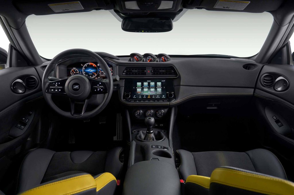 A triple-pod cluster of analog gauges sits atop the center dash, just as they did in the early Zs. The steering wheel has a retro aesthetic. The small round Z badges on the C pillars could have been pulled from a parts bin for the earliest cars.