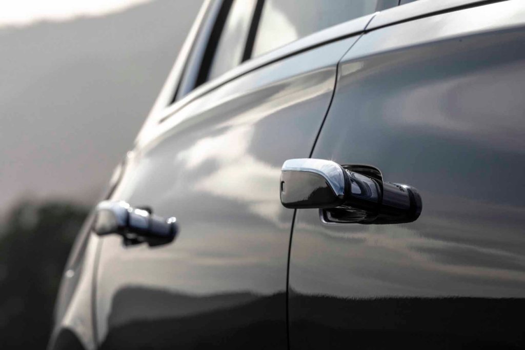 Luxurious accommodations enhance the ambiance. The front bucket seats and outboard back seats are upholstered with plush cushions and perforated leather. Flush outside door handles automatically protrude as the driver approaches. There’s also a soft-touch feature to insure that the doors close quietly.