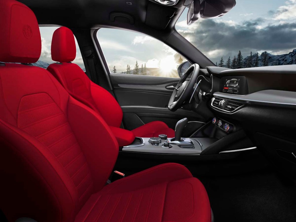 The Stelvio has ample space for four passengers. As in many vehicles, the center-rear fifth passenger suffers with limited head and knee room, a high, hard cushion and intrusion of the front console.