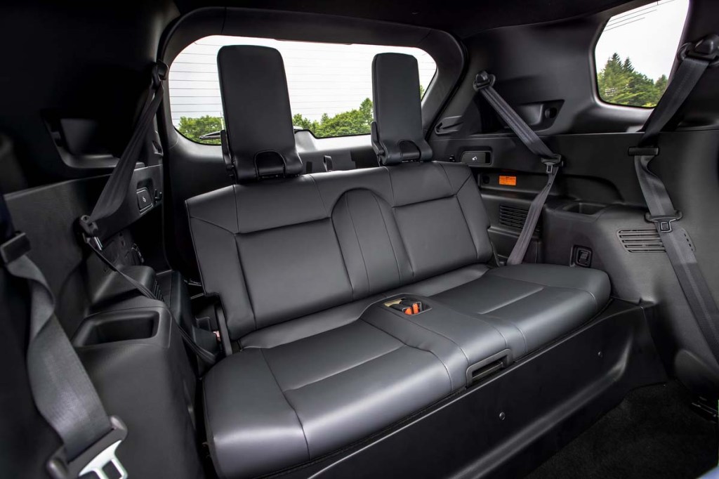 In the second row, the center position is marginal, though all three seats have fore-and-aft travel of about eight inches. That’s necessary because if they are not adjusted almost fully forward, there’s no knee room in the third row. So if the second-row passengers have decent comfort, the third row is uninhabitable except for watermelons, backpacks and legless gnomes.