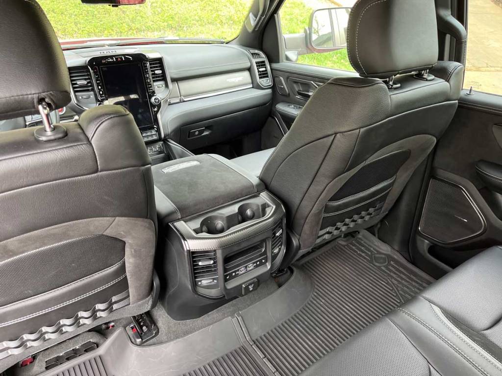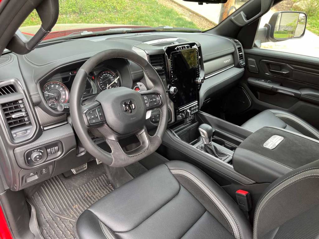 Inside the cabin, the RAM 1500 TRX, as optionally equipped, exudes comfort and luxury. The Crew Cab layout provides ample legroom and headspace for both front and rear passengers, making it suitable for long journeys with a full crew on board. The rear seat is positively cavernous, and the mix of premium materials (if so equipped) doesn’t stop in the front row. Option packages also provide plenty of mobile-device charging ports, rear climate control, and 115-volt standard household outlet.