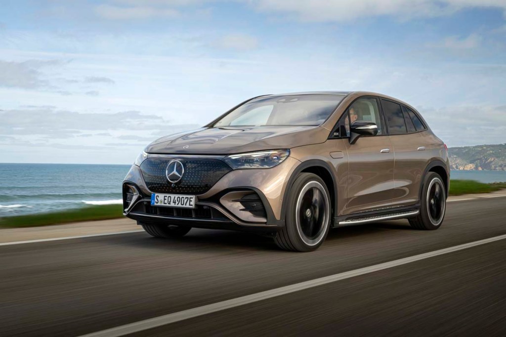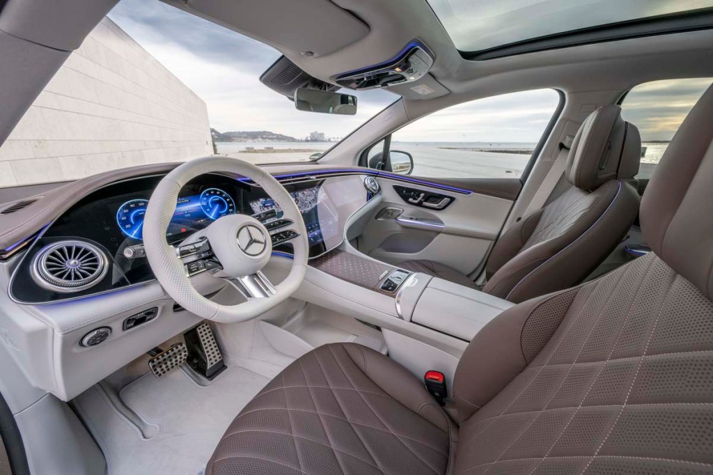 First, it has streamlined, eye-catching styling—basically an SUV version of the EQE sedan. Step inside to a luxury ambiance—perforated, heated and cooled brown leather upholstery with cream colored accents and a wood dash on the tester festooned with miniature Mercedes three-pointed stars.