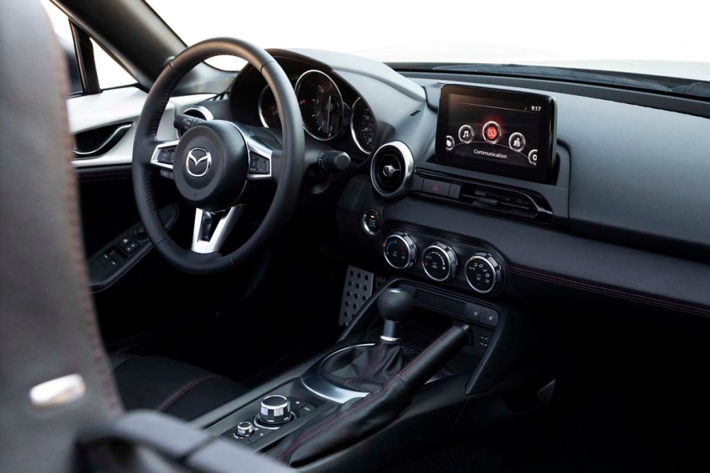 With just 49 cubic feet of space for the driver and passenger, the MX-5 is one of those sports car the driver is said to wear like a tailor-made suit. The sensation is highlighted by sport seats with grippy cloth covering and substantial bolstering to coddle the torso. Getting in and out, especially for taller drivers, can be a chore. Get in fanny first and twist legs and feet to avoid the door, door sill and steering wheel. Same thing getting out.