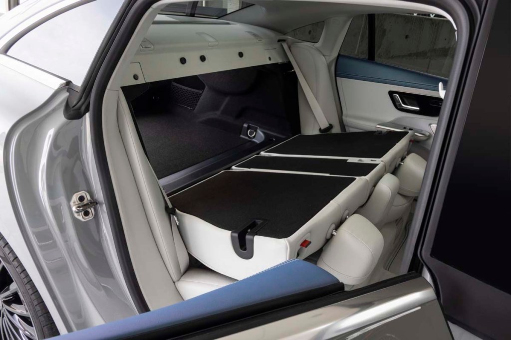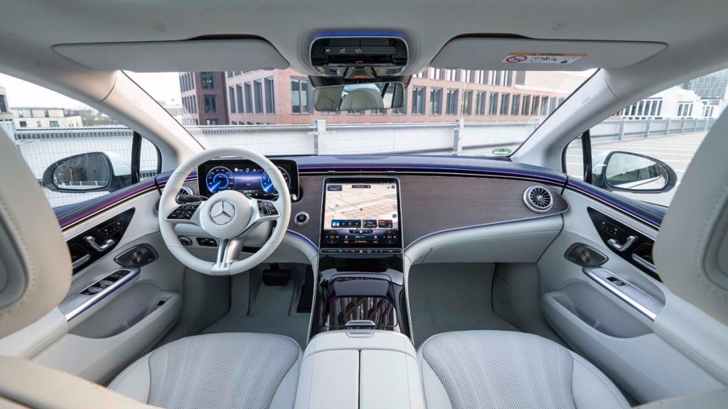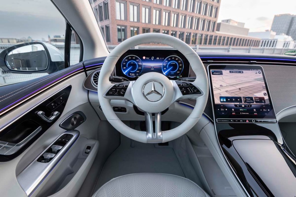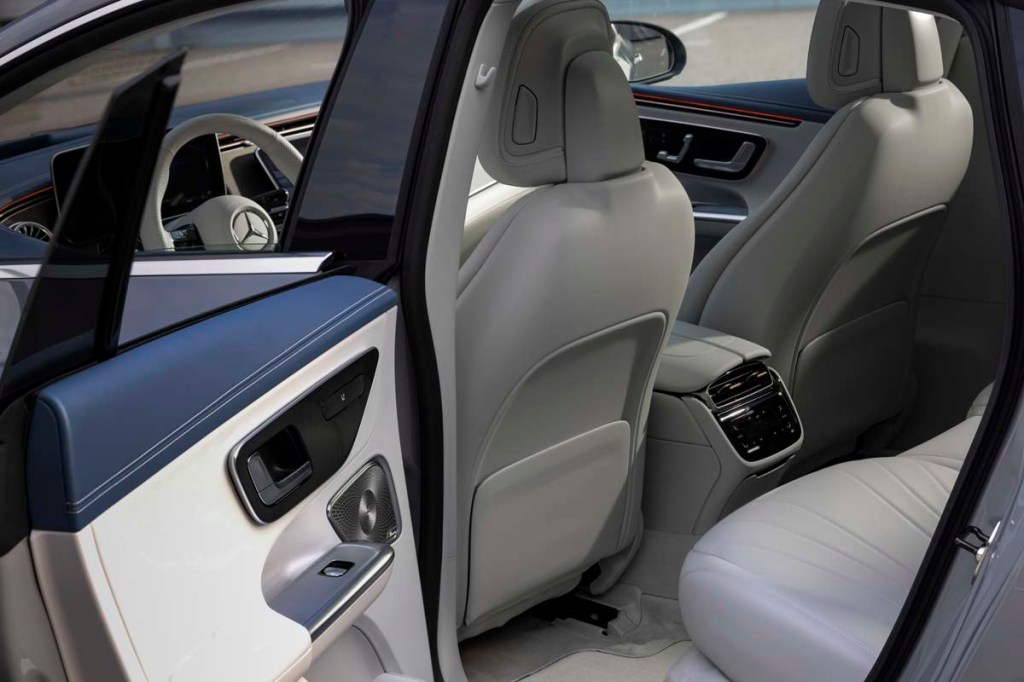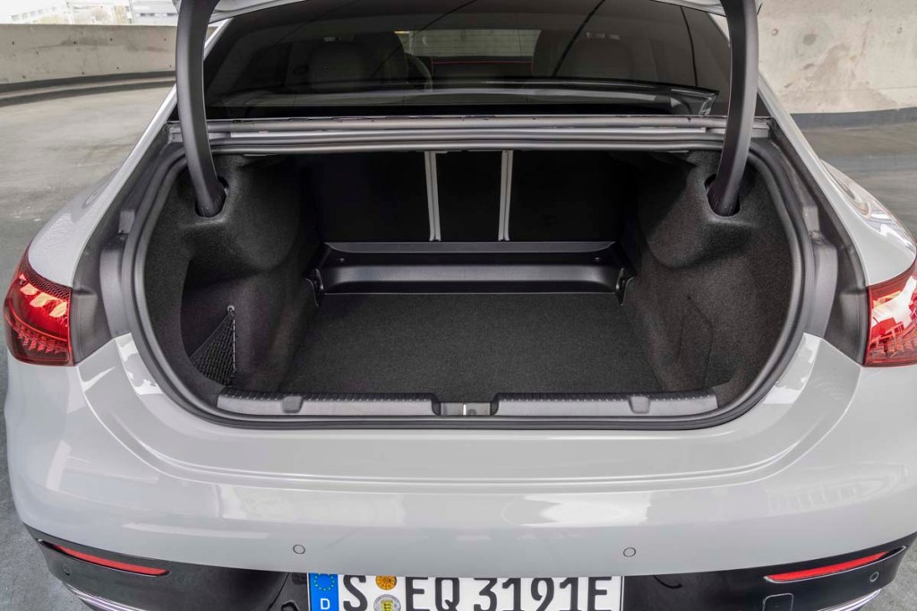 The design somewhat truncates the rear view through the back window. But never mind. With its inside and two outside mirrors properly adjusted (the original blind-spot warning), there’s never a question about what might be happening aft. The EQE does have blind-spot warning, but it’s not needed.