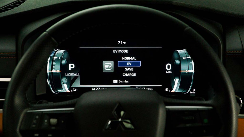 That doesn’t take anything away from the Outlander’s considerable package of desirable elements. Start with the power train. It’s a plug-in hybrid, or PHEV, with a 2.4-liter four-cylinder gasoline engine mated to two electric motors. In concert, they deliver 248 horsepower and 332 pound-feet of torque to all four wheels.